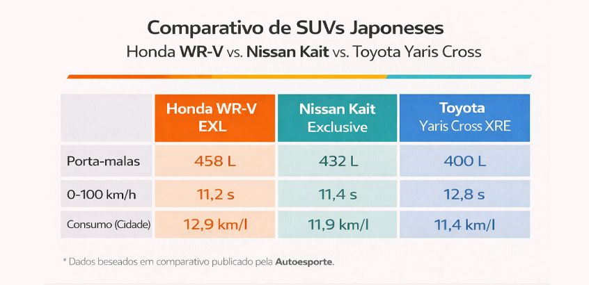 De acordo com o comparativo, o Honda WR-V apresenta aceleração de 0 a 100 km/h em 11,2 segundos e consumo urbano próximo de 12,9 km/l, números que mostram um desempenho consistente dentro da categoria e competitivo em relação a modelos como o Nissan Kait e o Toyota Yaris Cross.