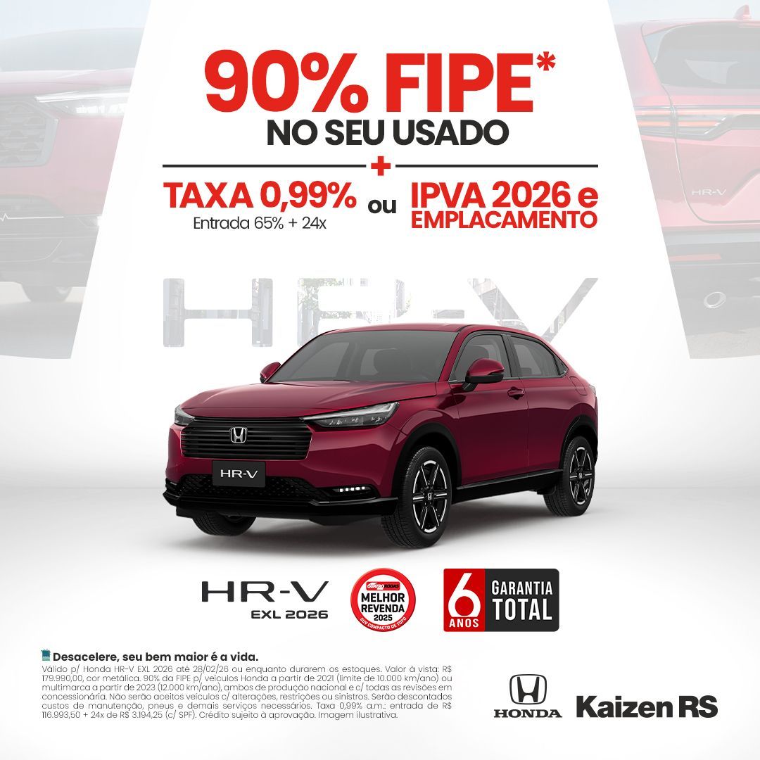 Válido p/ Honda HR-V EXL 2026 até 28/02/26 ou enquanto durarem os estoques. Valor à vista: R$ 179.990,00, cor metálica. 90% da FIPE p/ veículos Honda a partir de 2021 (limite de 10.000 km/ano) ou multimarca a partir de 2023 (12.000 km/ano), ambos de produção nacional e c/ todas as revisões em concessionária. Não serão aceitos veículos c/ alterações, restrições ou sinistros. Serão descontados custos de manutenção, pneus e demais serviços necessários. Taxa 0,99% a.m.: entrada de R$ 116.993,50 + 24x de R$ 3.194,25 (c/ SPF). Crédito sujeito à aprovação. Imagem ilustrativa.