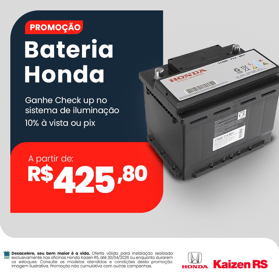 Oferta válida para instalação realizada exclusivamente nas oficinas Honda Kaizen RS, até 30/04/2026 ou enquanto durarem os estoques. Consulte os modelos atendidos e condições desta promoção. Imagem ilustrativa. Promoção não cumulativa com outras campanhas
