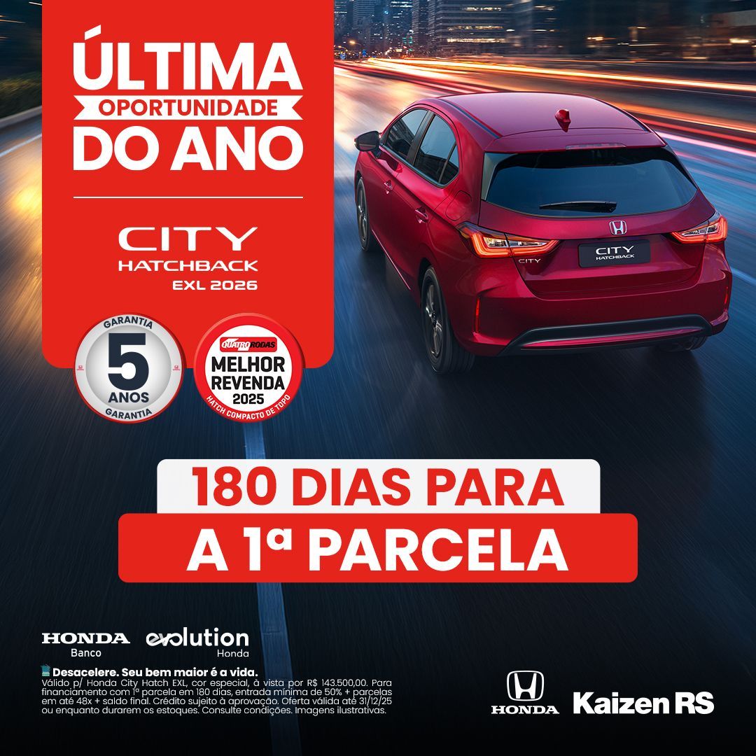 Válido p/ Honda City Hatch EXL, cor especial, à vista por R$ 143.500,00. Para financiamento com 1ª parcela em 180 dias, entrada mínima de 50% + parcelas em até 48x + saldo final. Crédito sujeito à aprovação. Oferta válida até 31/12/25 ou enquanto durarem os estoques. Consulte condições. Imagens ilustrativas.