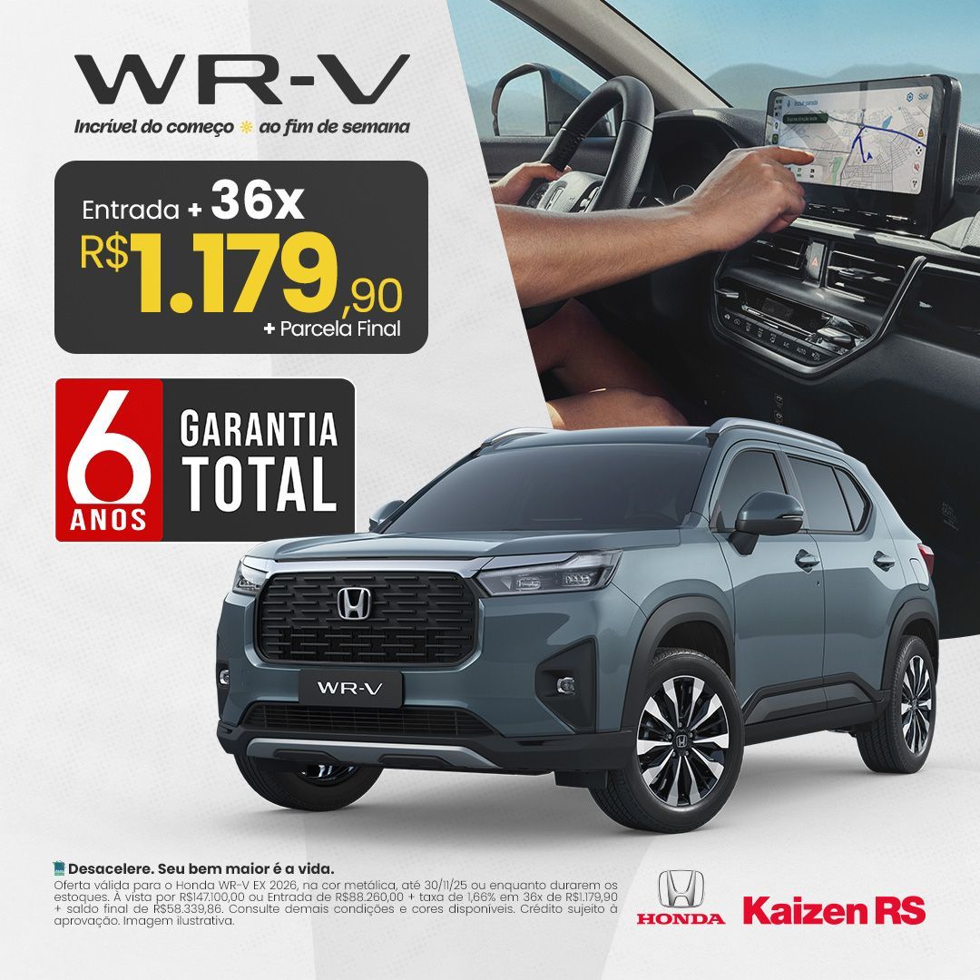 Oferta válida para o Honda WR-V EX 2026, na cor metálica, até 30/11/25 ou enquanto durarem os estoques. À vista por R$147.100,00 ou Entrada de R$88.260,00 + taxa de 1,66% em 36x de R$1.179,90 + saldo final de R$58.339,86. Consulte demais condições e cores disponíveis. Crédito sujeito à aprovação. Imagem ilustrativa.