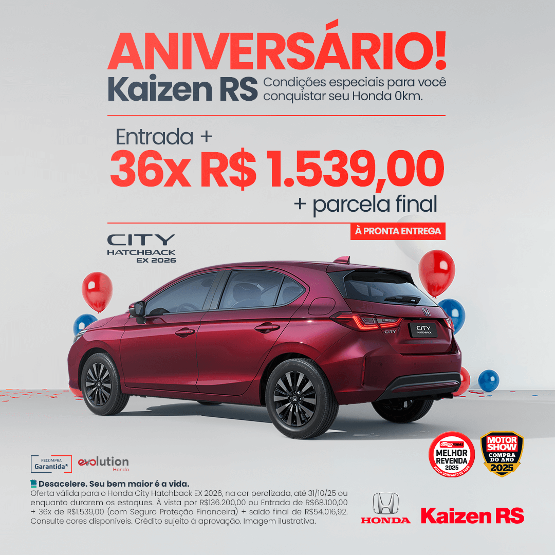 Oferta válida para o Honda City Hatchback EX 2026, na cor perolizada, até 31/10/25 ou enquanto durarem os estoques. À vista por R$136.200,00 ou Entrada de R$68.100,00 + 36x de R$1.539,00 (com Seguro Proteção Financeira) + saldo final de R$54.016,92. Consulte cores disponíveis. Crédito sujeito à aprovação. Imagem ilustrativa.
