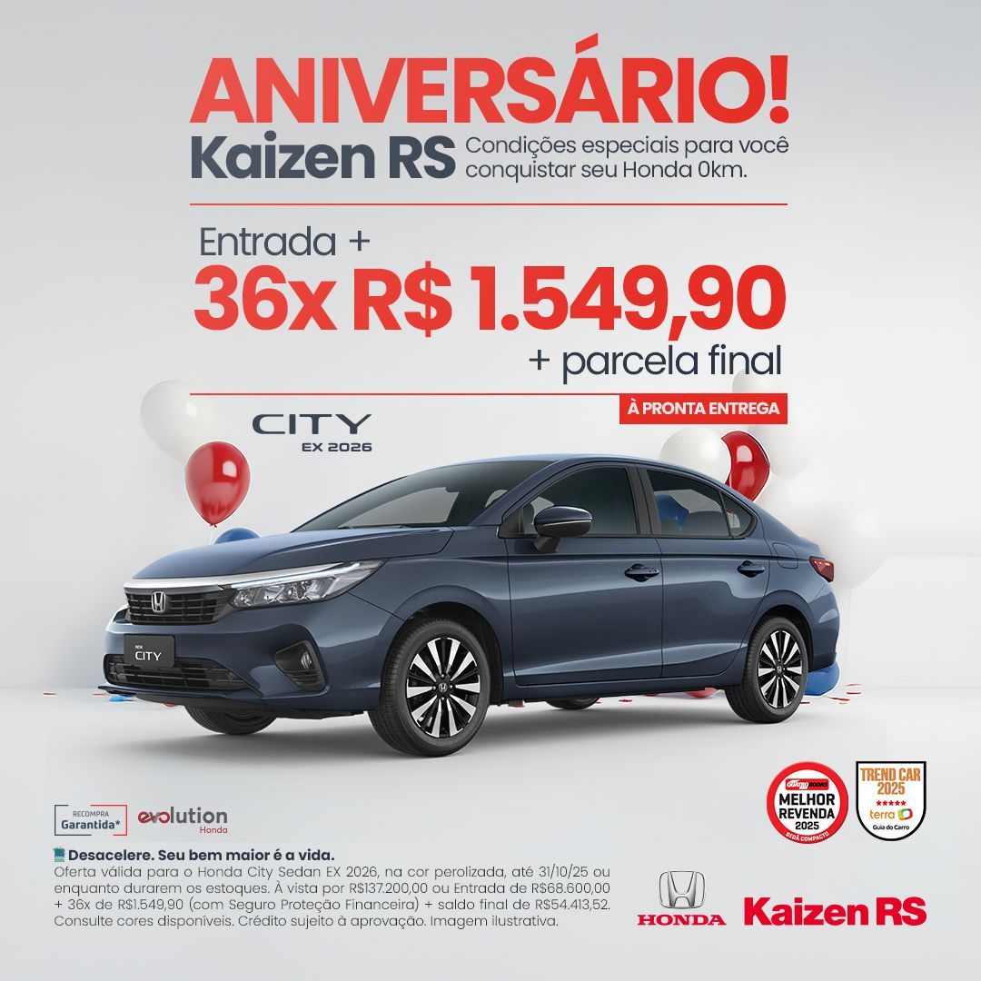 Oferta válida para o Honda City Sedan EX 2026, na cor perolizada, até 31/10/25 ou enquanto durarem os estoques. À vista por R$137.200,00 ou Entrada de R$68.600,00 + 36x de R$1.549,90 (com Seguro Proteção Financeira) + saldo final de R$54.413,52. Consulte cores disponíveis. Crédito sujeito à aprovação. Imagem ilustrativa.