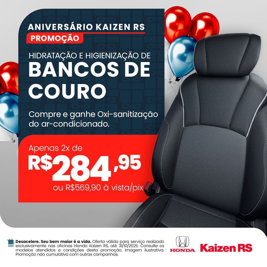 Oferta válida para serviço realizado exclusivamente nas oficinas Honda Kaizen RS, até 31/10/2025. Consulte os modelos atendidos e condições desta promoção. Imagem ilustrativa. Promoção não cumulativa com outras campanhas.
