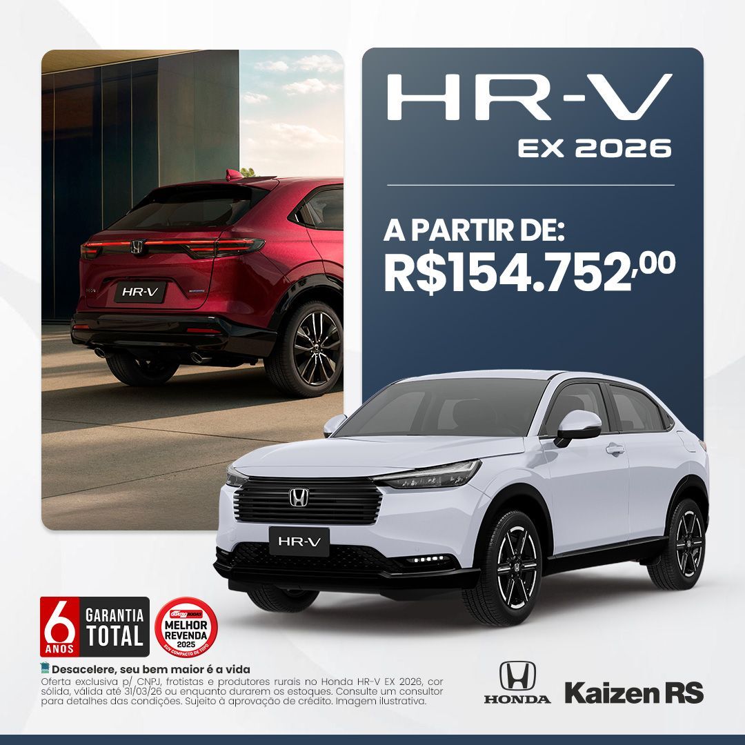 Oferta exclusiva p/ CNPJ, frotistas e produtores rurais no Honda HR-V EX 2026, cor sólida, válida até 31/03/26 ou enquanto durarem os estoques. Consulte um consultor para detalhes das condições. Sujeito à aprovação de crédito. Imagem ilustrativa.