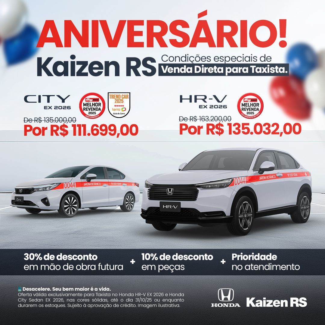 Oferta válida exclusivamente para Taxista no Honda HR-V EX 2026 e Honda City Sedan EX 2026, nas cores sólidas, até o dia 31/10/25 ou enquanto durarem os estoques. Sujeito à aprovação de crédito. Imagem ilustrativa.