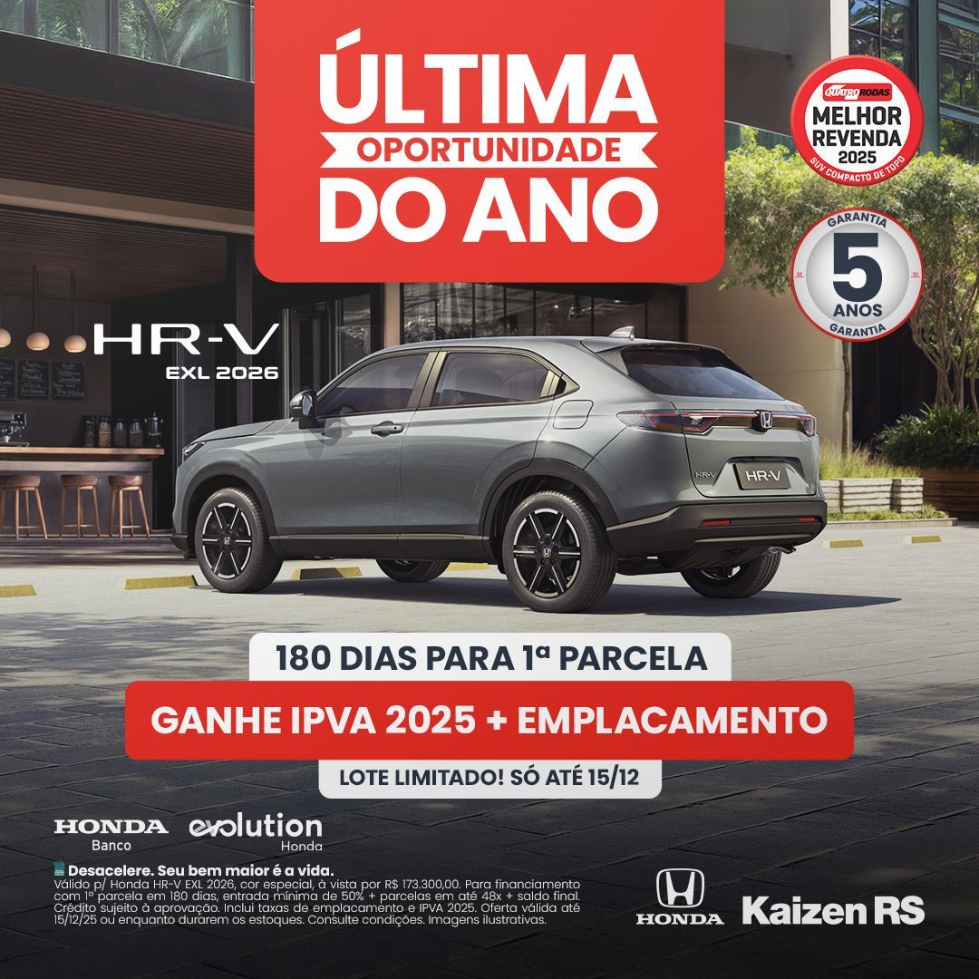 Válido p/ Honda HR-V EXL 2026, cor especial, à vista por R$ 173.300,00. Para financiamento com 1ª parcela em 180 dias, entrada mínima de 50% + parcelas em até 48x + saldo final. Crédito sujeito à aprovação. Inclui taxas de emplacamento e IPVA 2025. Oferta válida até 15/12/25 ou enquanto durarem os estoques. Consulte condições. Imagens ilustrativas.