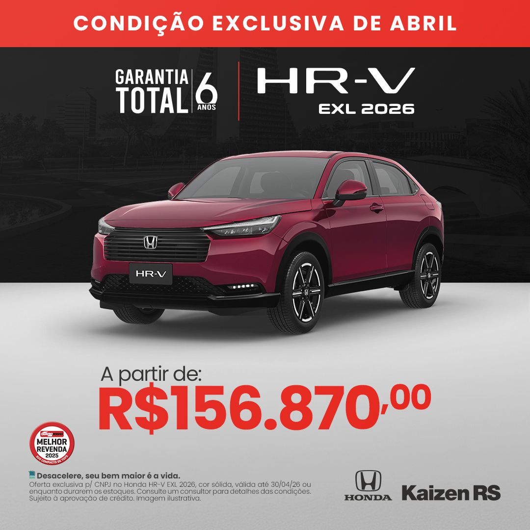 Oferta exclusiva p/ CNPJ no Honda HR-V EXL 2026, cor sólida, válida até 30/04/26 ou enquanto durarem os estoques. Consulte um consultor para detalhes das condições. Sujeito à aprovação de crédito. Imagem ilustrativa.