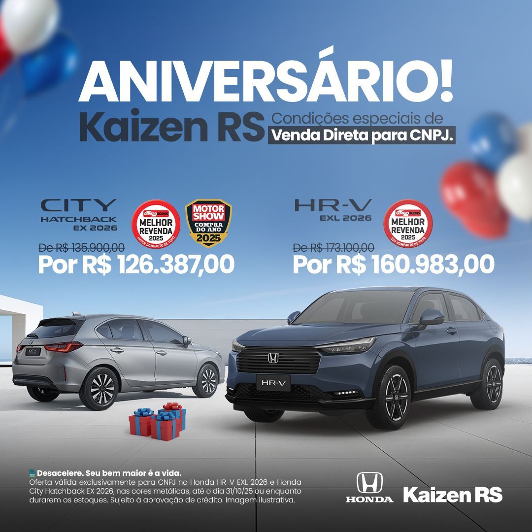 Oferta válida exclusivamente para CNPJ no Honda HR-V EXL 2026 e Honda City Hatchback EX 2026, nas cores metálicas, até o dia 31/10/25 ou enquanto durarem os estoques. Sujeito à aprovação de crédito. Imagem ilustrativa.