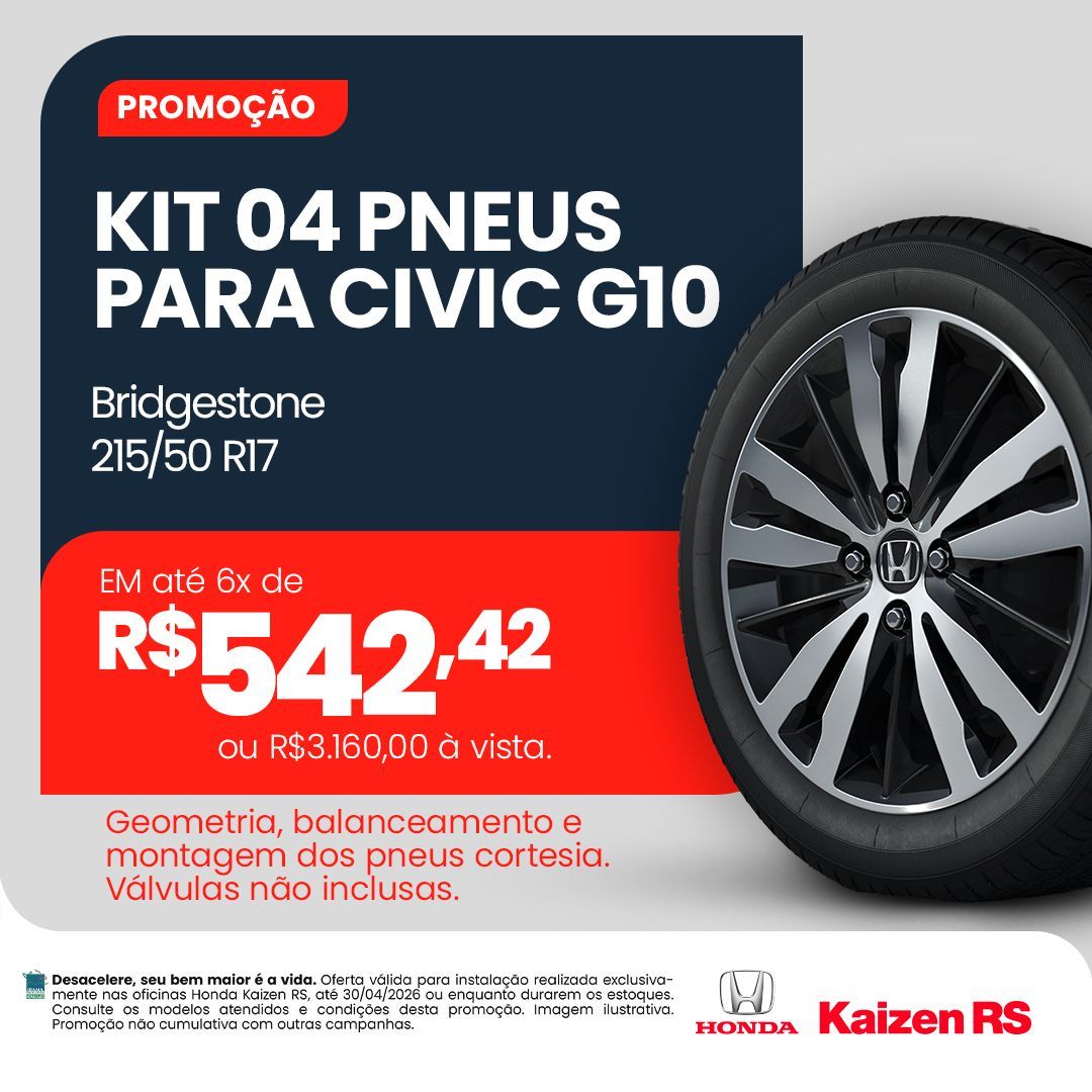 Oferta válida para instalação realizada exclusivamente nas oficinas Honda Kaizen RS, até 30/04/2026 ou enquanto durarem os estoques. Consulte os modelos atendidos e condições desta promoção. Imagem ilustrativa. Promoção não cumulativa com outras campanhas