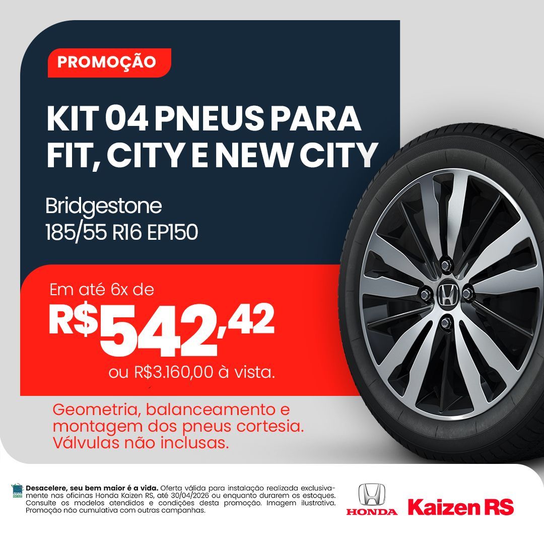 Oferta válida para instalação realizada exclusivamente nas oficinas Honda Kaizen RS, até 30/04/2026 ou enquanto durarem os estoques. Consulte os modelos atendidos e condições desta promoção. Imagem ilustrativa. Promoção não cumulativa com outras campanhas