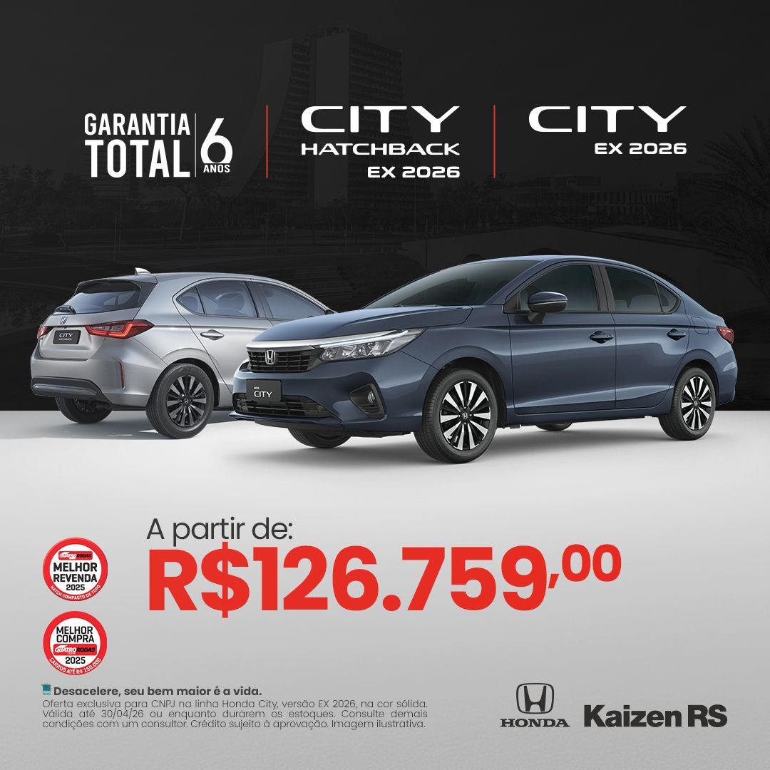 Oferta exclusiva para CNPJ na linha Honda City, versão EX 2026, na cor sólida. Válida até 30/04/26 ou enquanto durarem os estoques. Consulte demais condições com um consultor. Crédito sujeito à aprovação. Imagem ilustrativa.