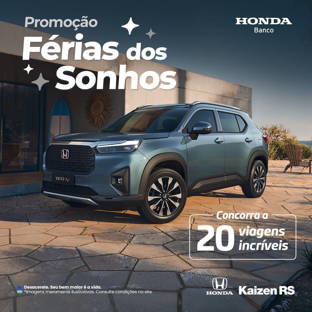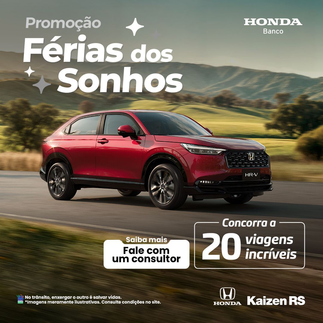 Quem comprar um Honda 0 km na Honda Kaizen RS com financiamento, consórcio ou seguro da Honda Serviços Financeiros ganha números da sorte para concorrer a viagens de R$ 50 mil. E quem escolher o novo Honda WR-V recebe 3 chances extras! É simples: compre seu Honda, cadastre o contrato no app Honda Serviços Financeiros e participe automaticamente dos sorteios. Quer saber como participar e aproveitar as melhores condições? Complete o formulário e nossa equipe entra em contato com você rapidamente!