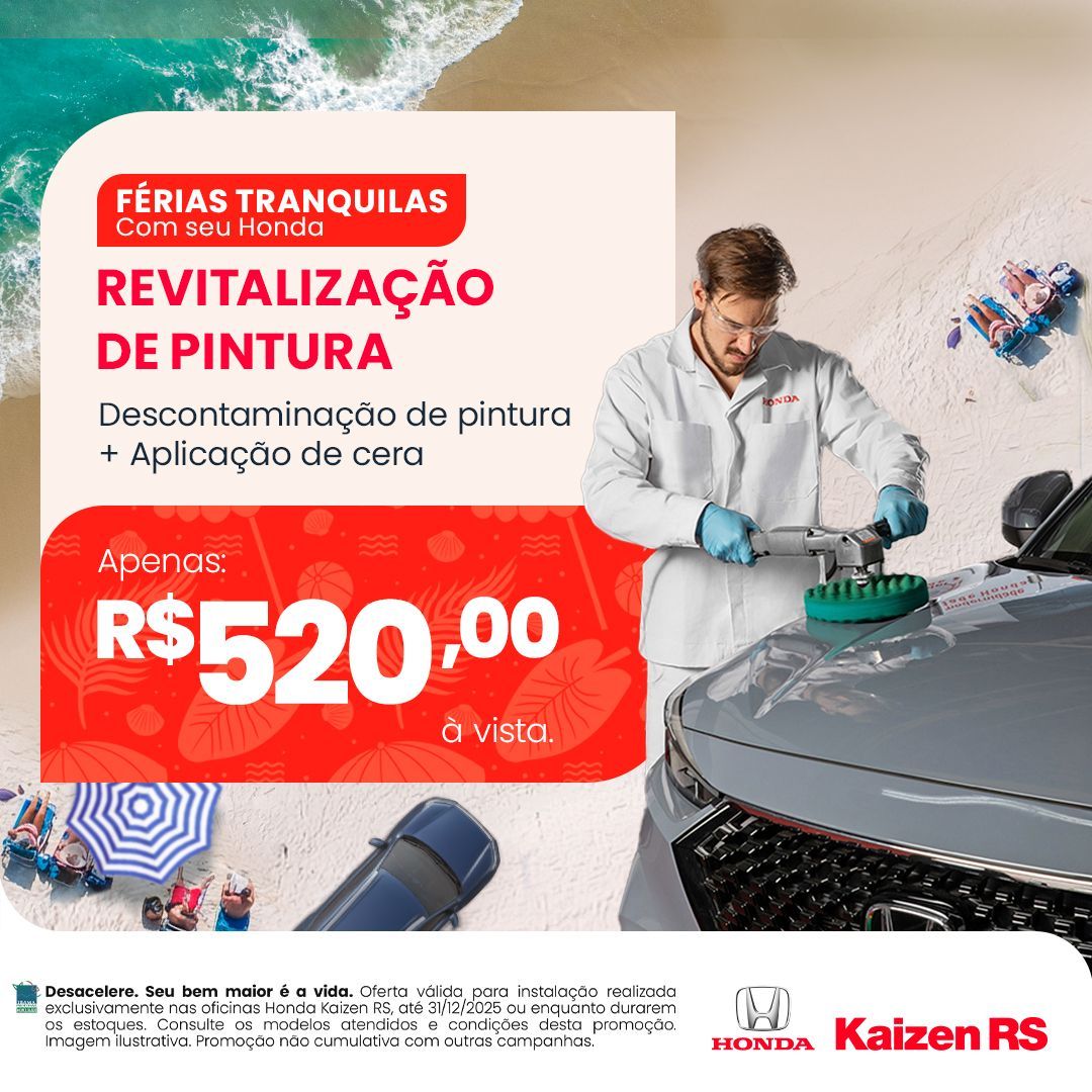 Desacelere. Seu bem maior é a vida. Oferta válida para serviço realizado exclusivamente nas oficinas Honda Kaizen RS, até 31/12/2025 ou enquanto durarem os estoques. Consulte os modelos atendidos e condições desta promoção. Imagem ilustrativa. Promoção não cumulativa com outras campanhas.