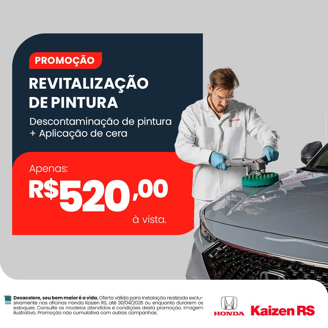 Oferta válida para instalação realizada exclusivamente nas oficinas Honda Kaizen RS, até 30/04/2026 ou enquanto durarem os estoques. Consulte os modelos atendidos e condições desta promoção. Imagem ilustrativa. Promoção não cumulativa com outras campanhas.
