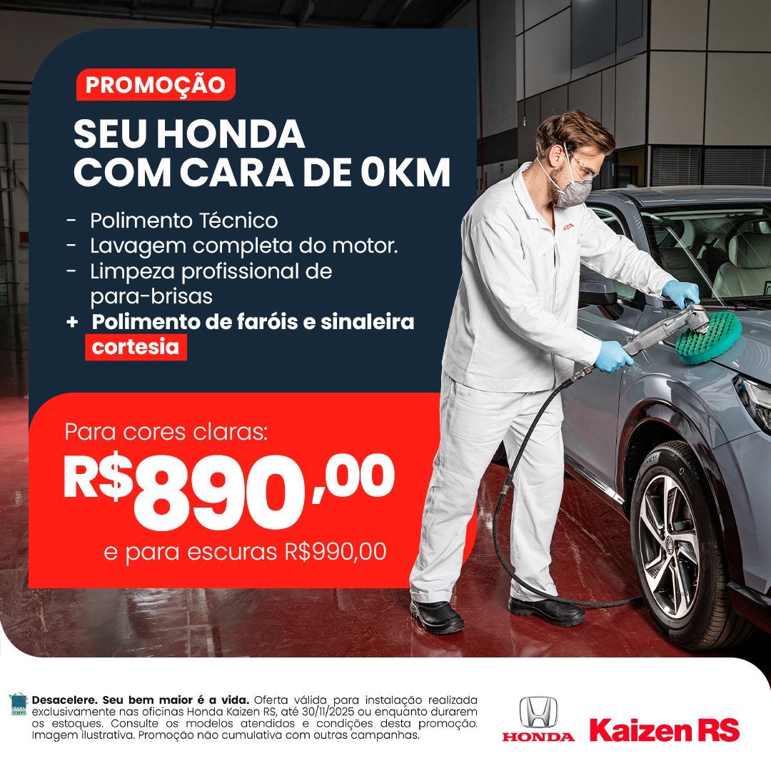 Oferta válida para instalação realizada exclusivamente nas oficinas Honda Kaizen RS, até 30/11/2025 ou enquanto durarem os estoques. Consulte os modelos atendidos e condições desta promoção. Imagem ilustrativa. Promoção não cumulativa com outras campanhas.