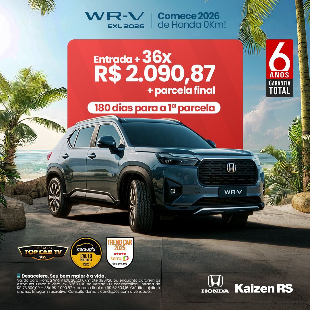 Válido para Honda WR-V EXL 26/26 0Km até 31/01/26 ou enquanto durarem os estoques. Preço à vista R$ 157.600,00 na versão EXL cor metálica. Entrada de R$ 78.800,00 + 36x R$ 2.090,87 + parcela final de R$ 62.504,16. Crédito sujeito à análise. Imagem ilustrativa. Consulte demais condições com o vendedor.