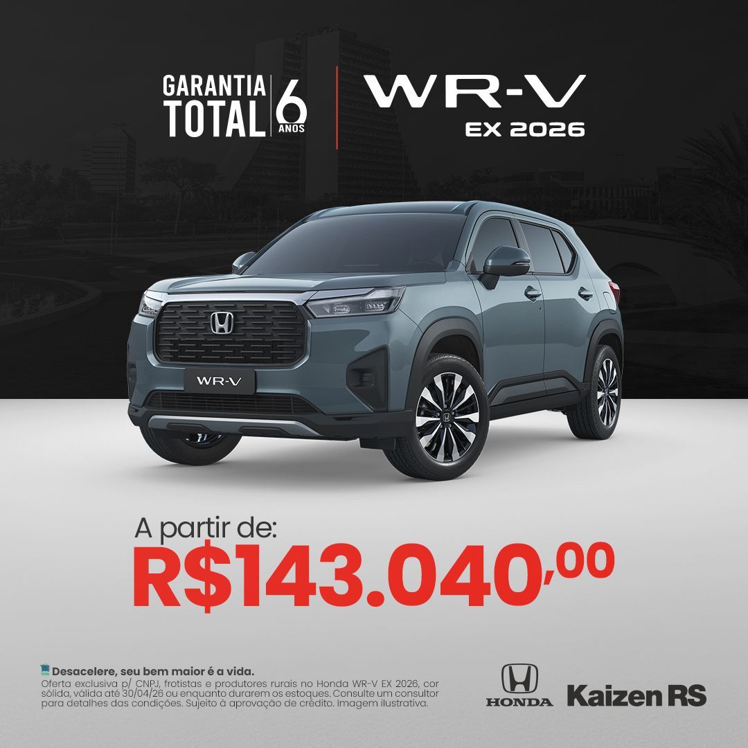 Oferta exclusiva p/ CNPJ, frotistas e produtores rurais no Honda WR-V EX 2026, cor sólida, válida até 30/04/26 ou enquanto durarem os estoques. Consulte um consultor para detalhes das condições. Sujeito à aprovação de crédito. Imagem ilustrativa.